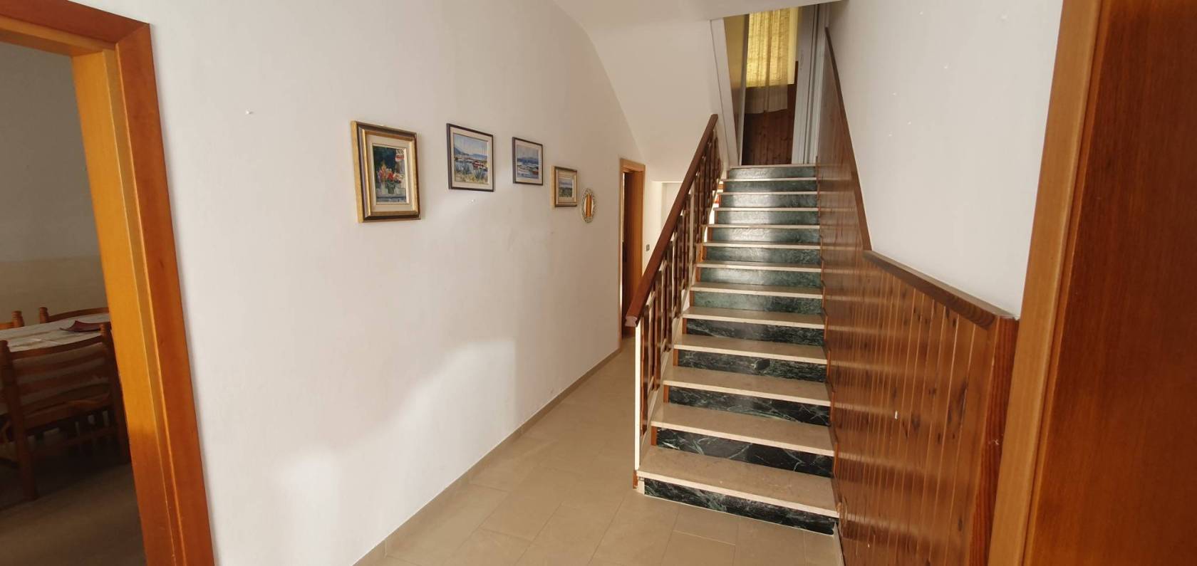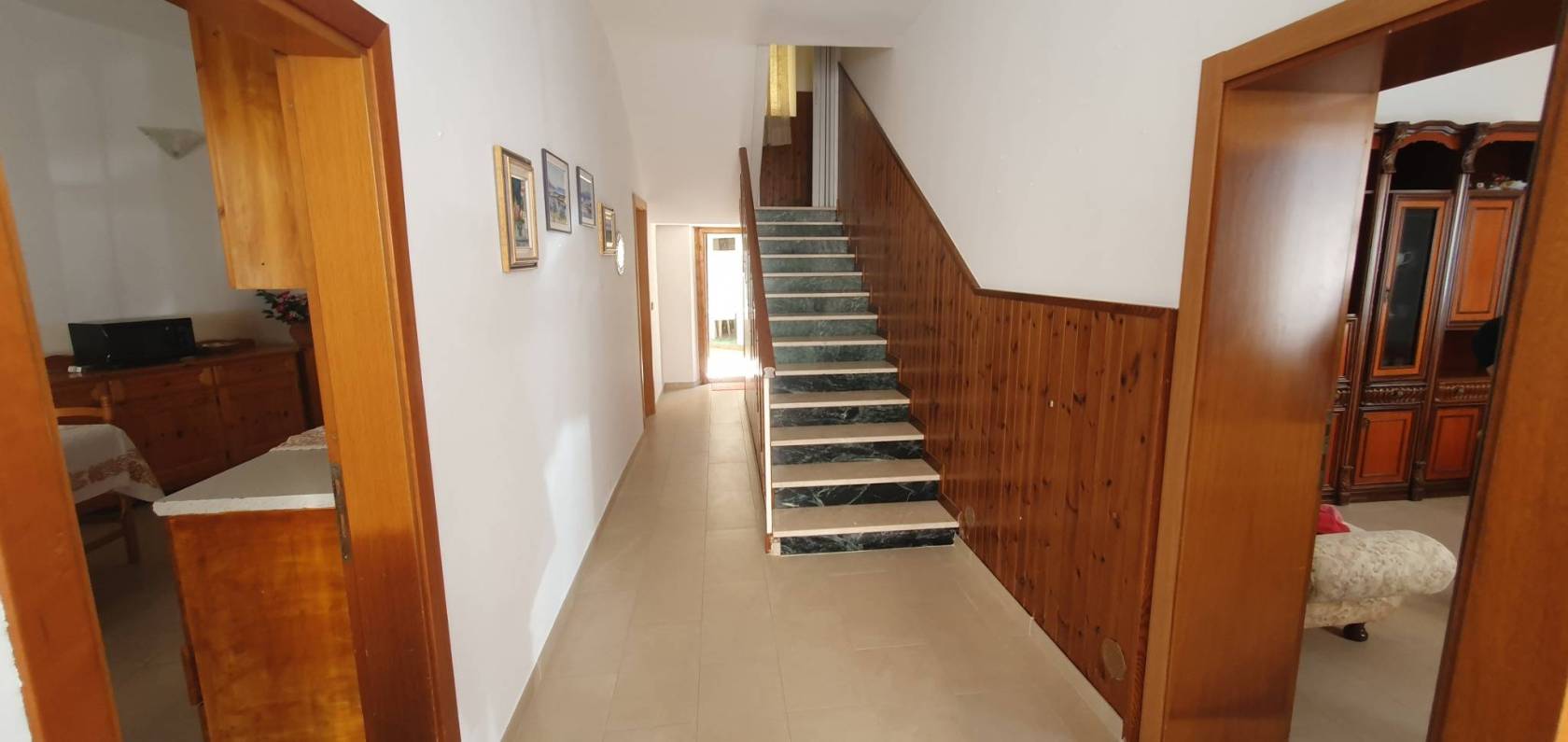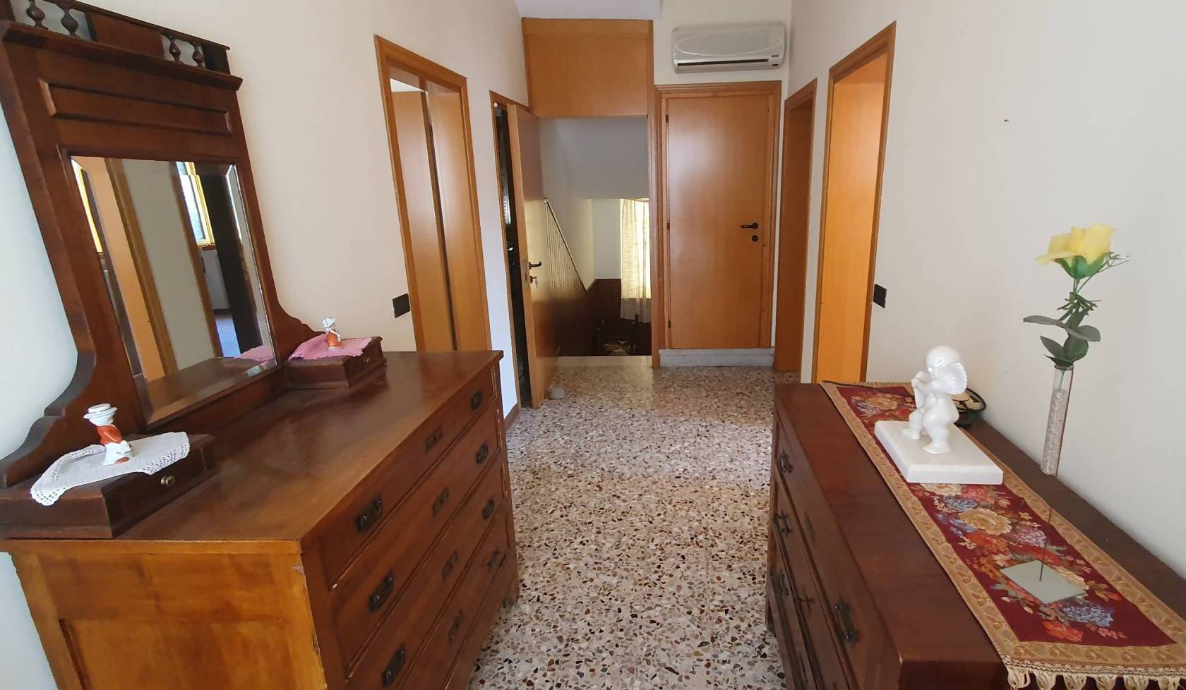 Il secondo piano viene raggiunto tramite un'ampia e comoda scala. Qui troviamo ben TRE CAMERE DOPPIE, di cui 1 con un spazioso ripostiglio. Il corridoio che conduce alle camere è ampio e finestrato, attrezzato con l'aria condizionata.