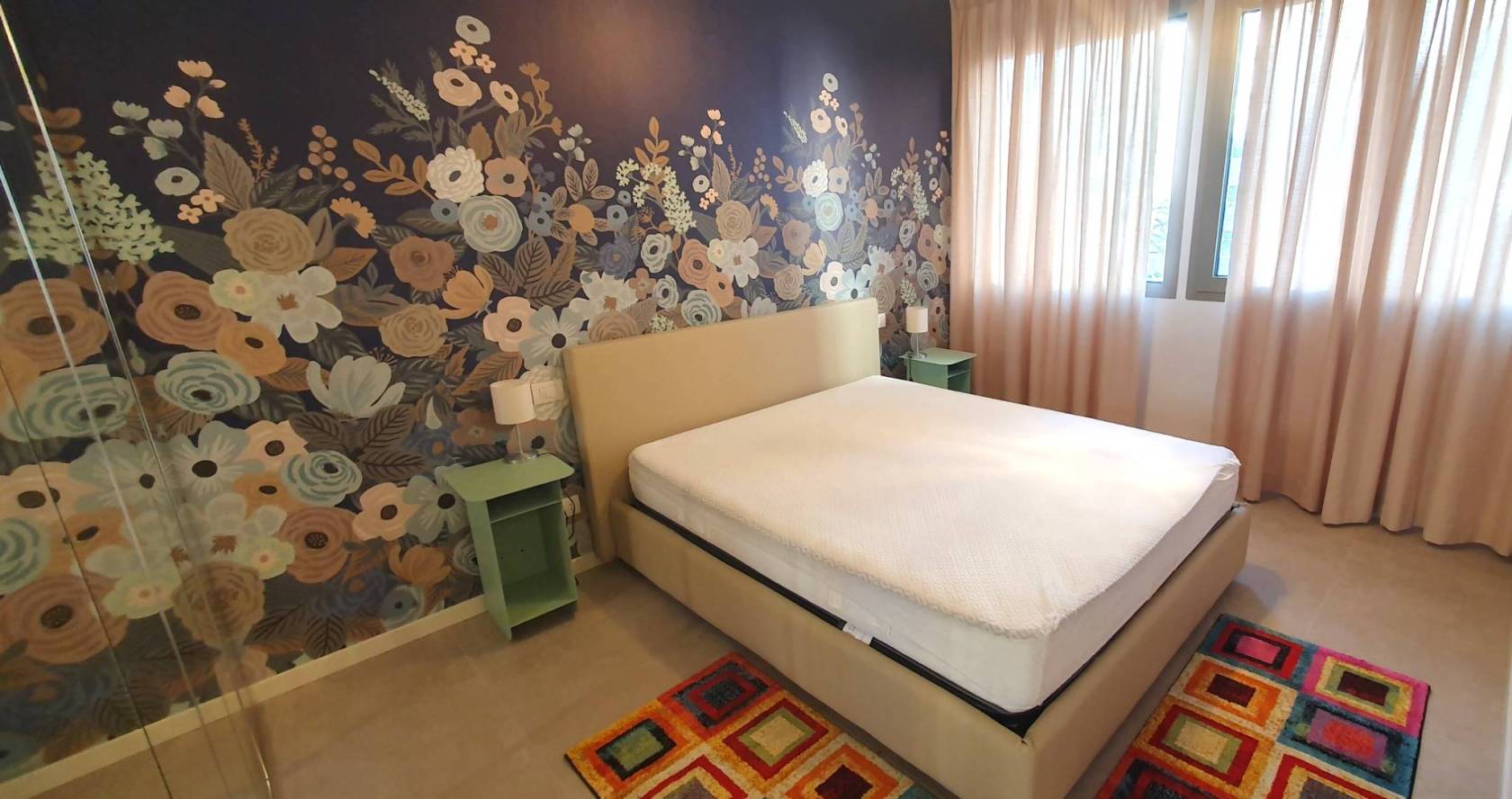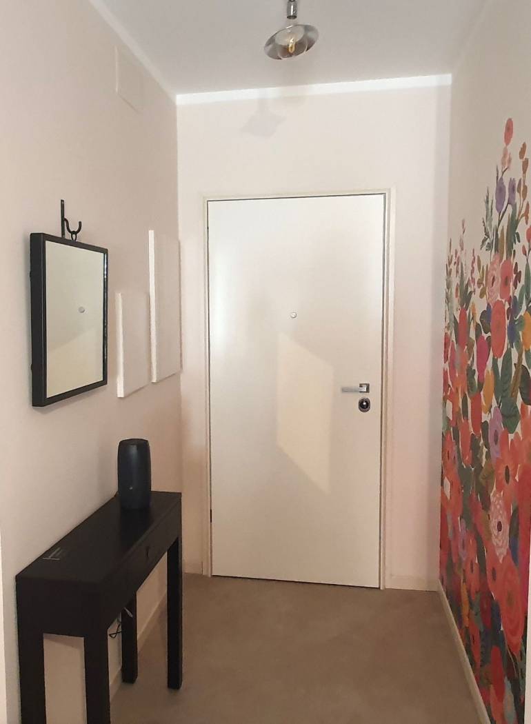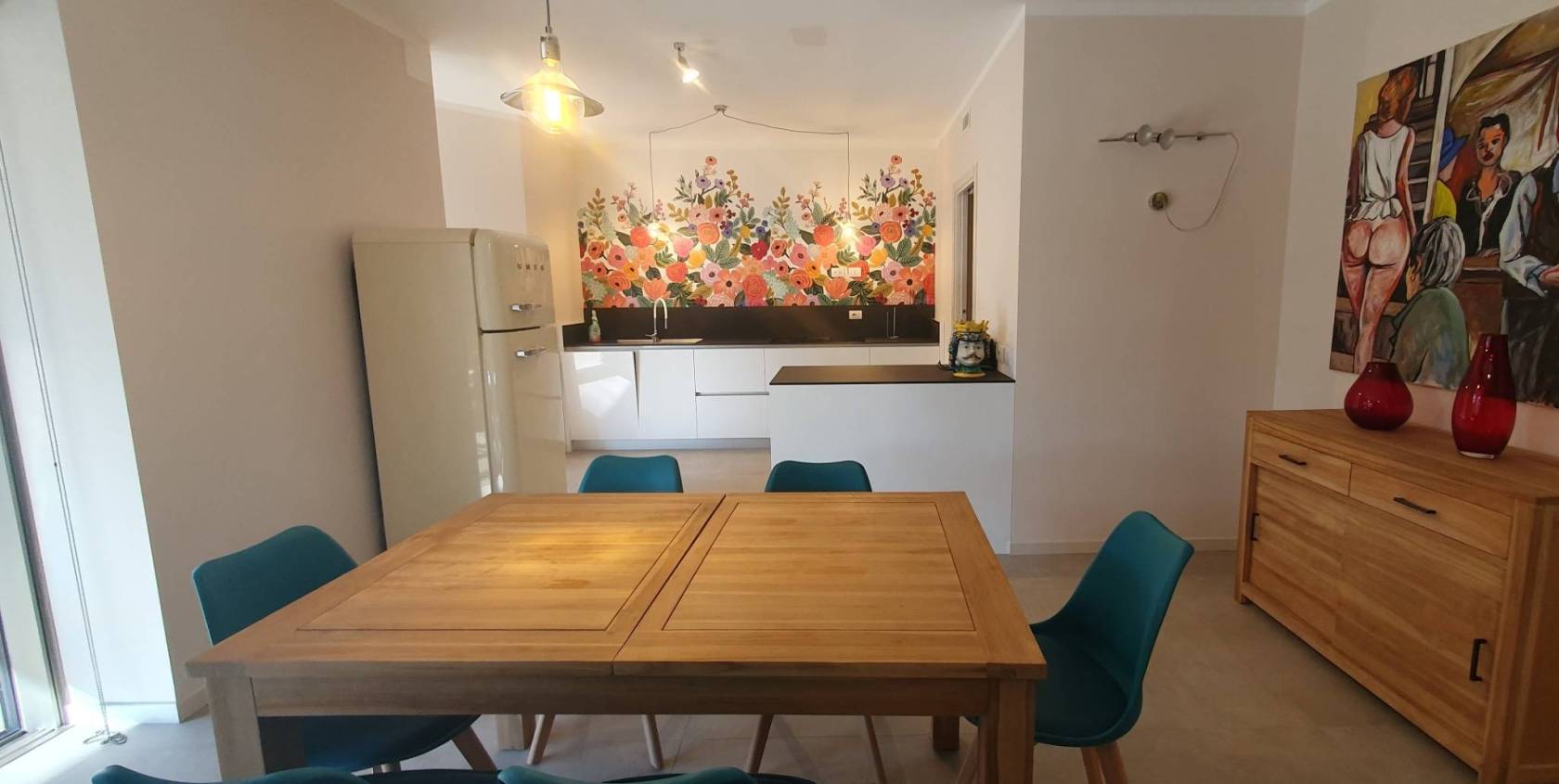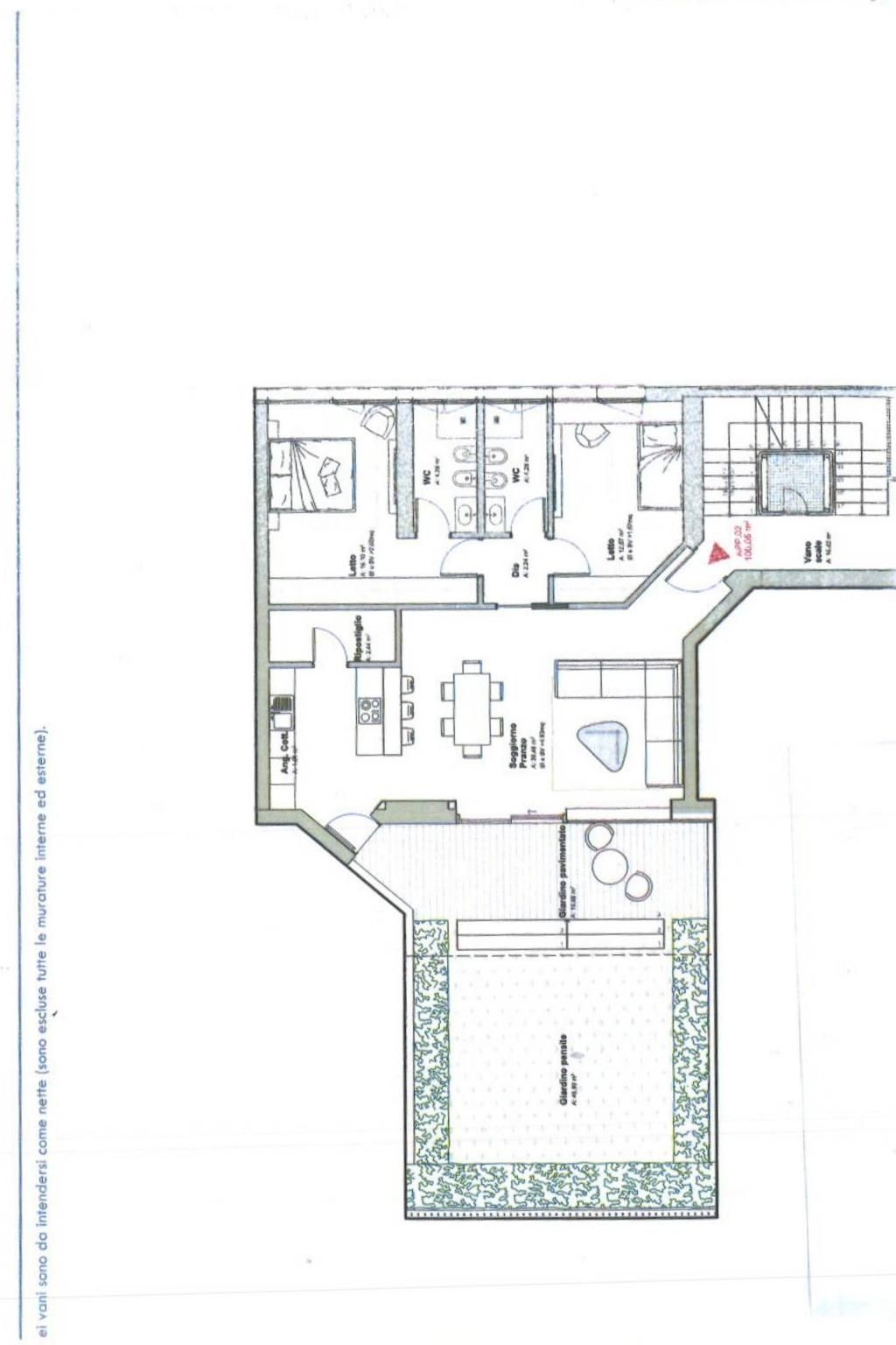 Dall'ingresso si accede all'ampia sala di 25 mq con l'angolo cucina. L'ambiente è luminosissimo grazie alle ampie vetrate scorrevoli con doppio ingresso sul esterno composto dalla LOGGIA DI CIRCA 30 MQ PAVIMENTATA IN LEGNO che ospita la zona pranzo esterno con la zona relax e IL GIARDINO DI CIRCA 60 mq .