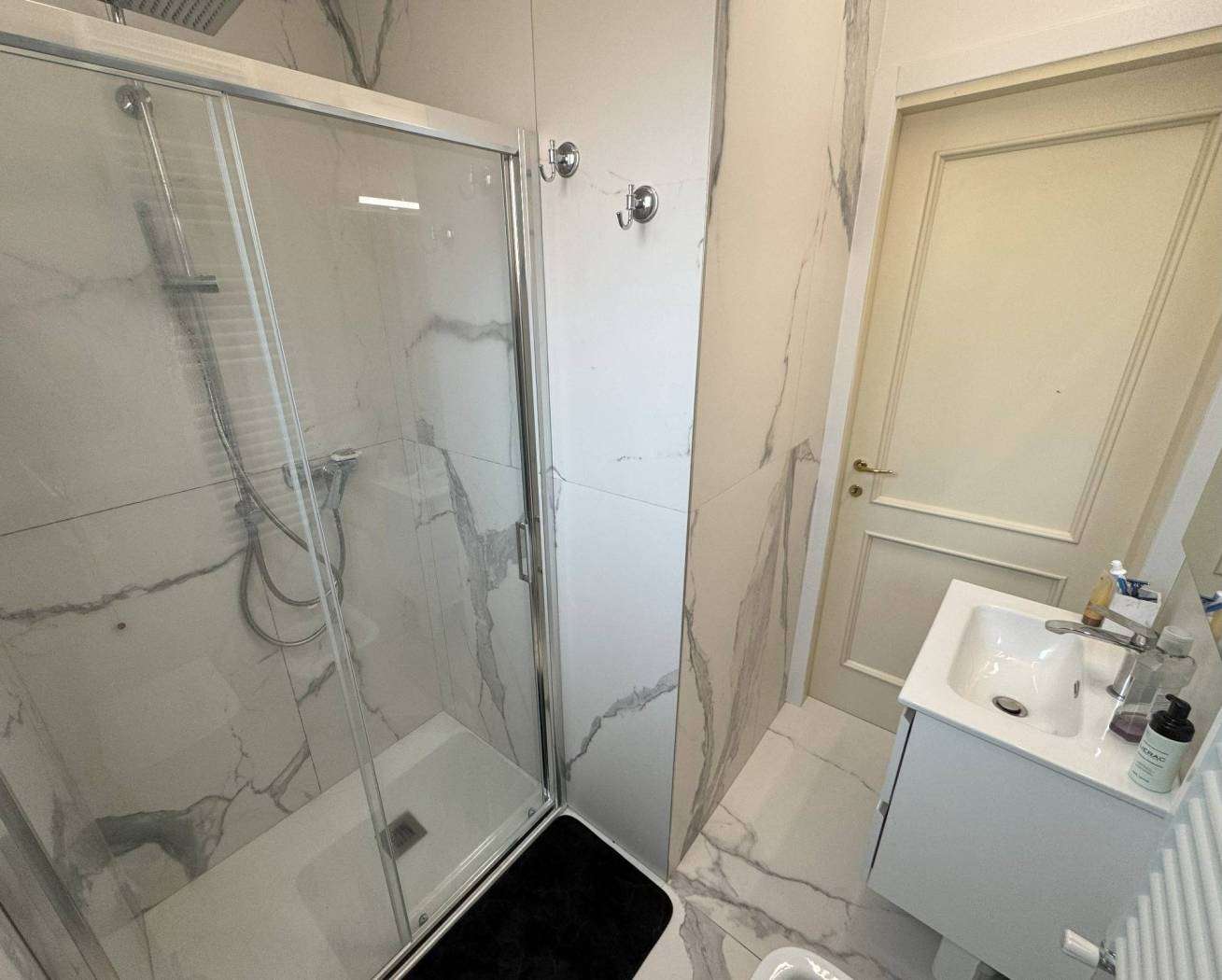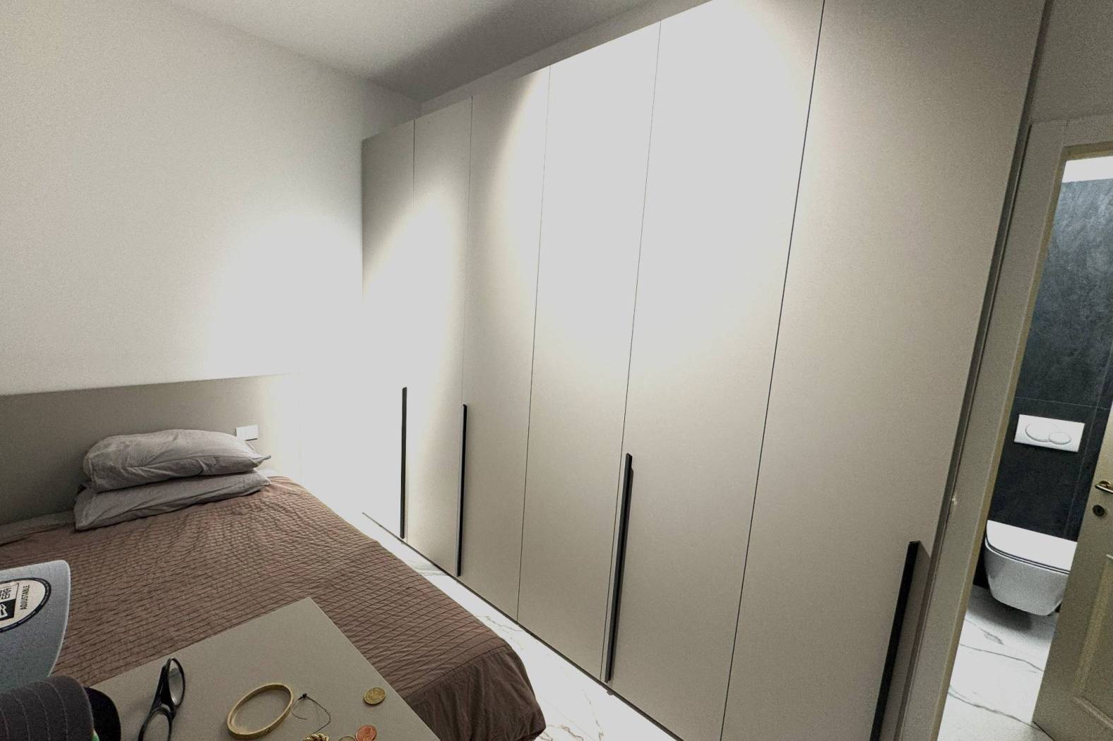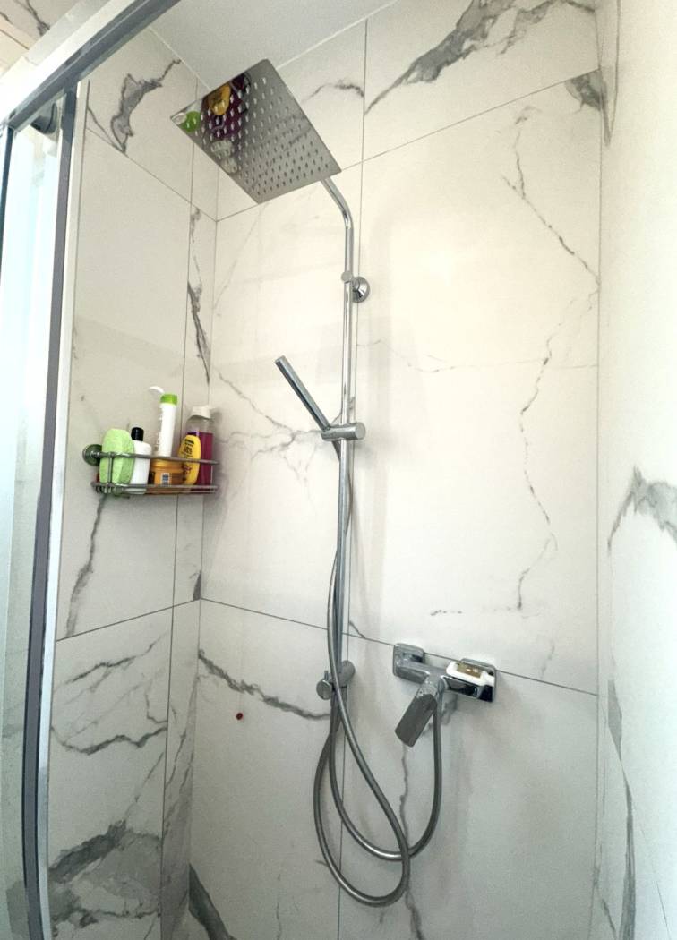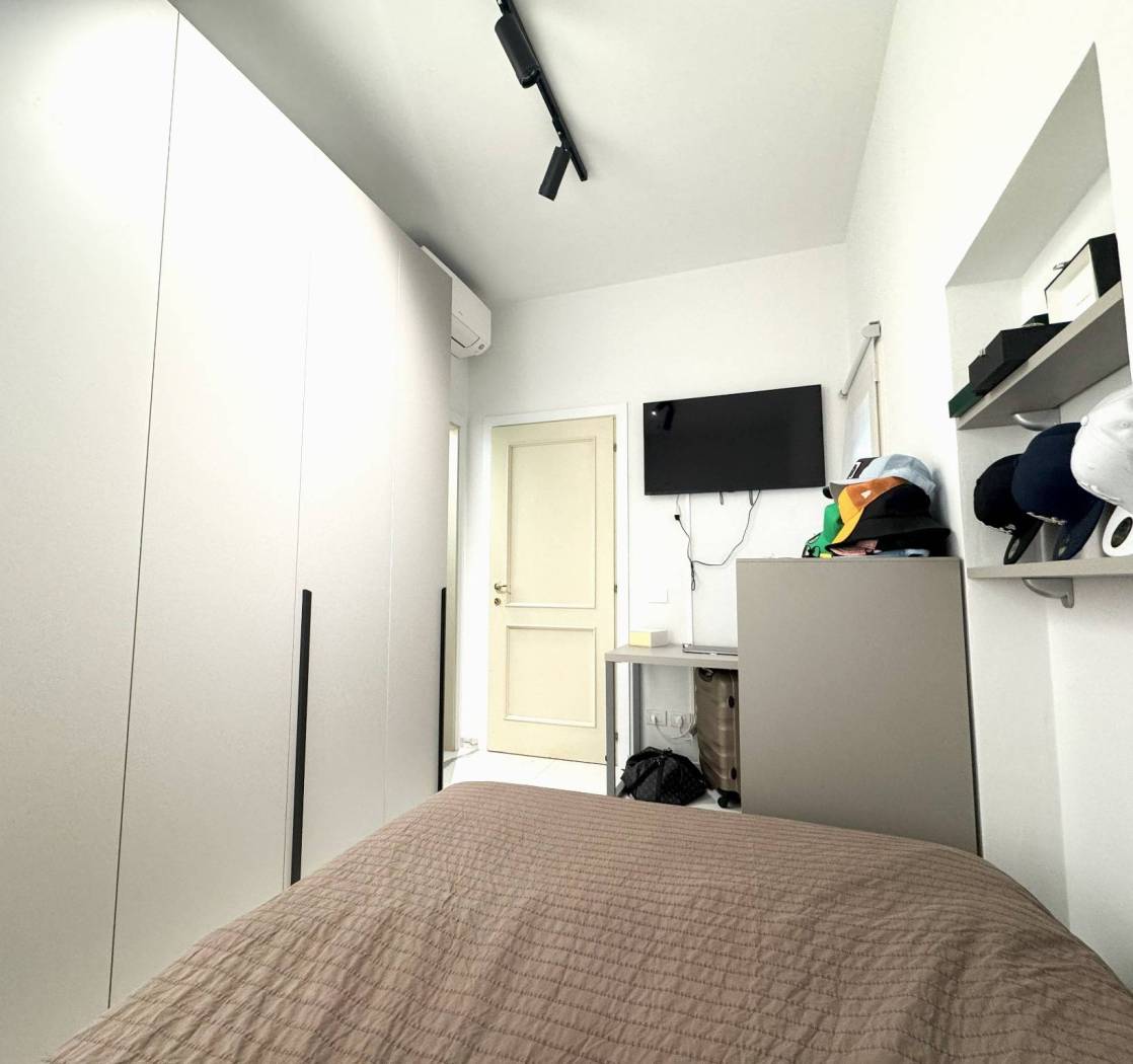 Dall'ingresso si accede alla sala con l'angolo cucina. Dalla sala da una parte, si accede alla camera matrimoniale con comodissima e spaziosa cabina armadio e il balcone. Affianco troviamo il bagno con con il box doccia. Da altra parte della sala vi è l'ingresso alla seconda camera, singola con il suo bagno di servizio.