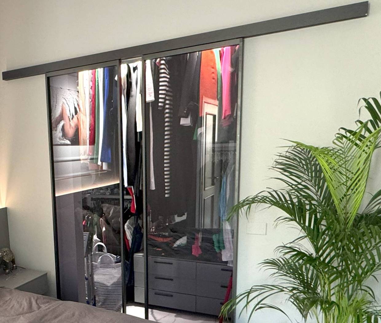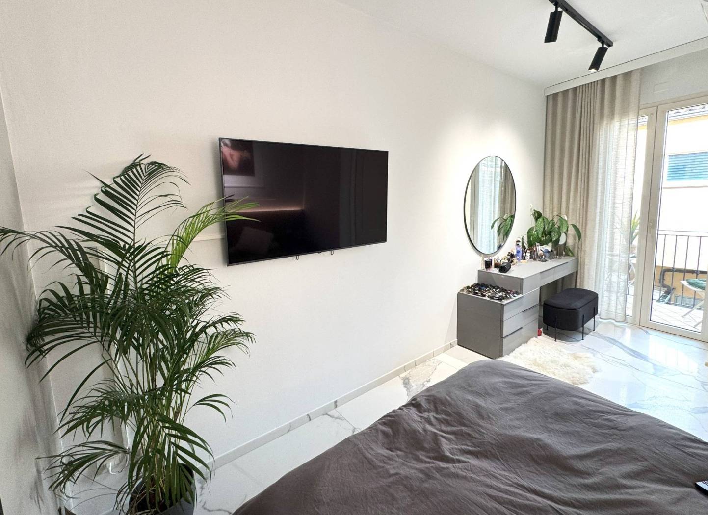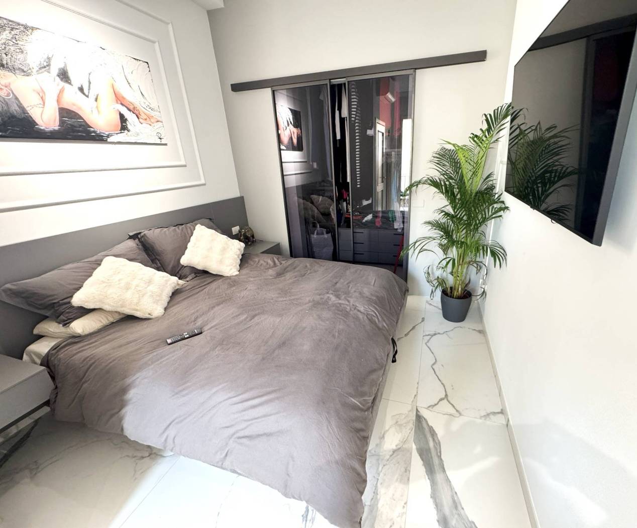 Dall'ingresso si accede alla sala con l'angolo cucina. Dalla sala da una parte, si accede alla camera matrimoniale con comodissima e spaziosa cabina armadio e il balcone. Affianco troviamo il bagno con con il box doccia. Da altra parte della sala vi è l'ingresso alla seconda camera, singola con il suo bagno di servizio.