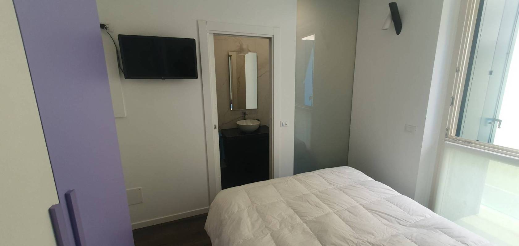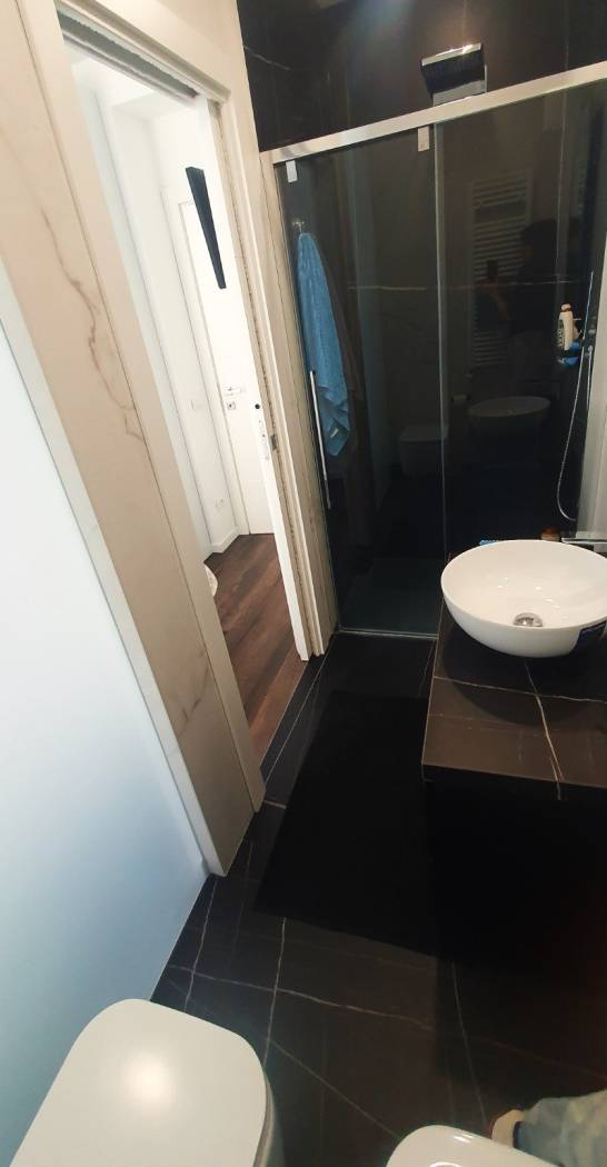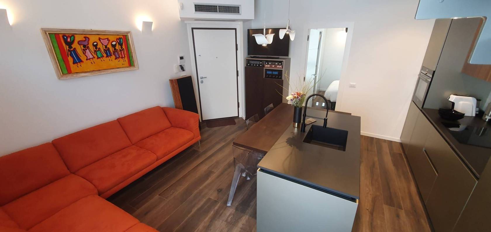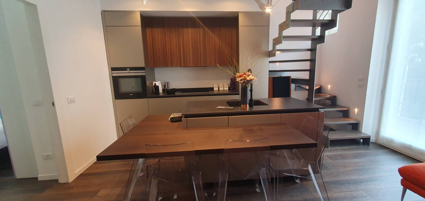 L'appartamento al primo piano, raggiungibile anche in ascensore, si apre sulla luminosa zona living con cucina di design a vista, alla zona giorno dona la luminosità l'apertura sul terrazzo abitabile, oltre all'altezza del soffitto del soggiorno che arriva ai 5 metri dal soggiorno si accede
