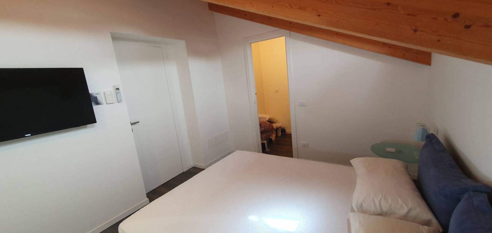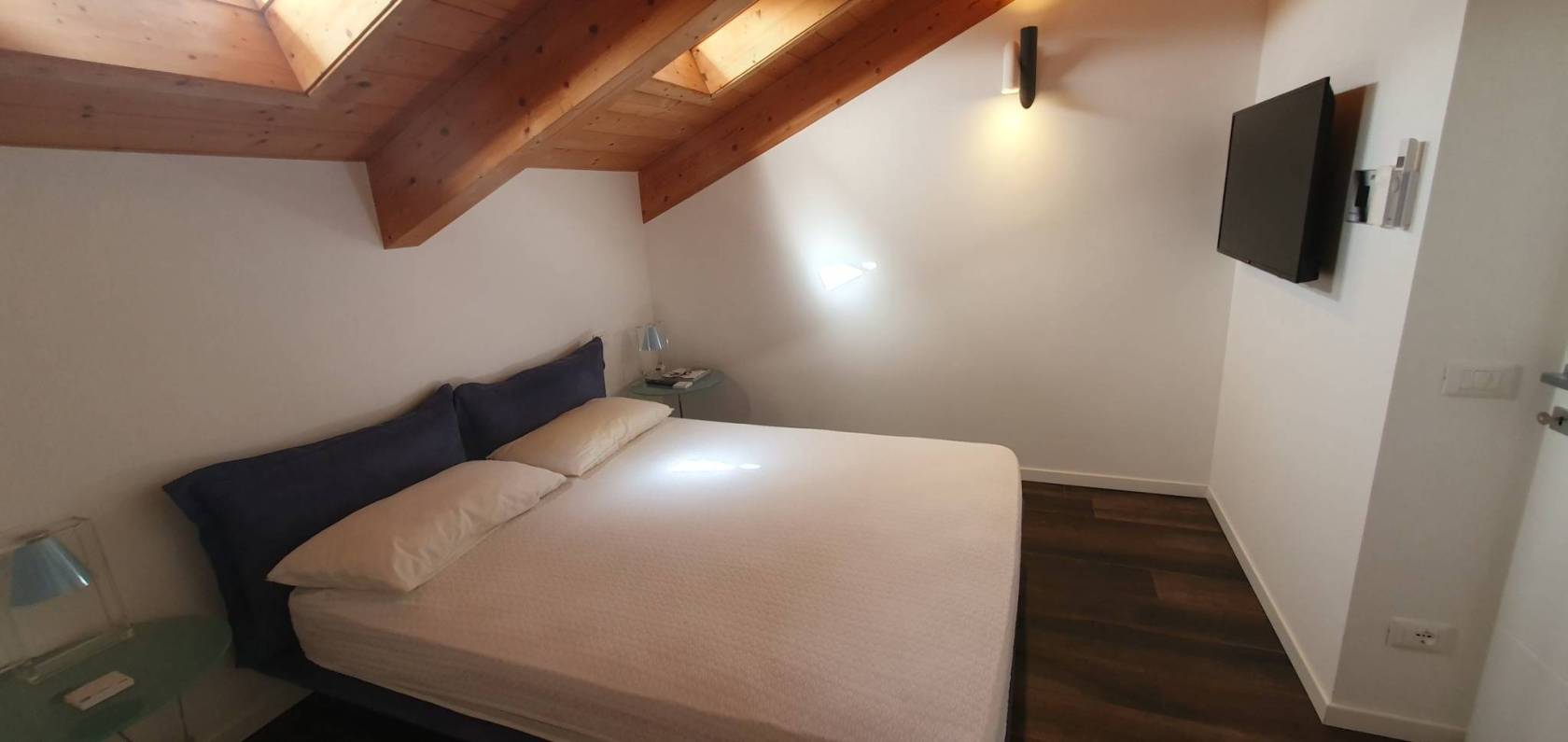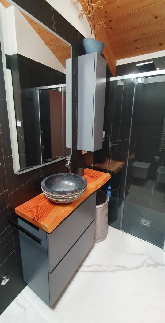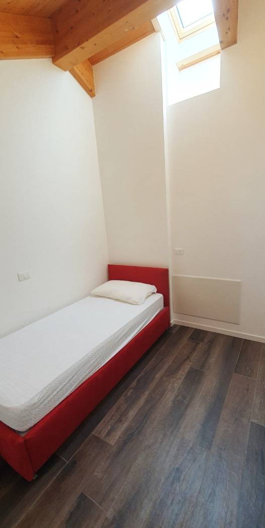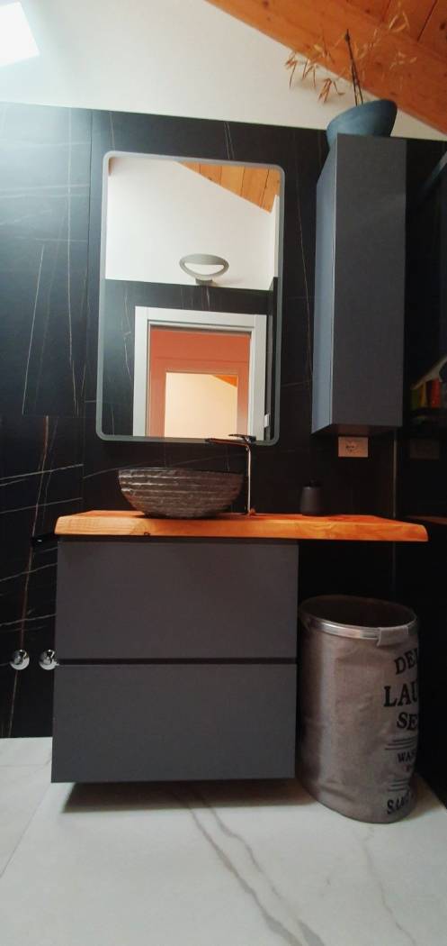 alla camera matrimoniale con bagno privato in camera. Dal soggiorno si accede attraverso una scala in acciaio e legno che porta nella zona notte parzialmente mansardata tutta con il tetto con le travi in legno a vista, molto d'effetto, e perfettamente abitabile (con l'altezza minima di 1,60),la camera matrimoniale dispone di una sua propria cabina armadio, sa seconda camera è singola con l'altezza massima di 3,50 metri, inoltre vi è un altro bagno con il box doccia, arredato con l'effetto del contrasto dei materiali tra il legno grezzo e la pietra nera.